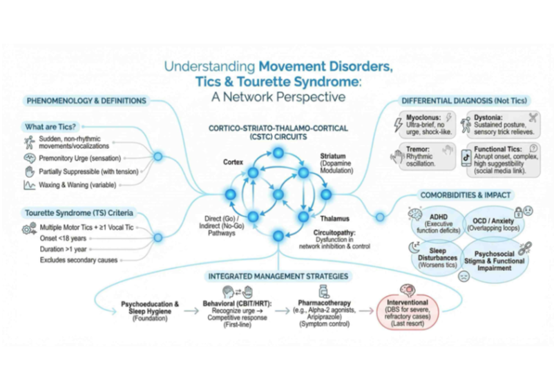 A abordagem transcende modelos localizacionistas rígidos e adota a lente de circuitopatias: sintomas emergem da disfunção de redes de controle motor e executivo, moduladas por neuroquímica (dopamina, GABA, glutamato, noradrenalina, serotonina).